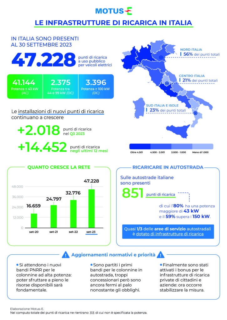 Secondo i dati divulgati da Motus-E, relativi allo scorso 30 settembre, sono in totale 47.228 i punti di ricarica ad accesso pubblico sul territorio italiano, un incremento del 44,1% rispetto allo stesso periodo del 2022. Nell’ultimo trimestre (luglio-settembre) sono stati installati 2.018 charging point, per un cumulato totale nei 9 mesi del 2023 di 10.456 punti di ricarica, un record mai registrato in precedenza. Riguardo alla distribuzione delle infrastrutture sul territorio, nel Sud e nelle Isole si concentra il 23% del totale, il 21% sono al Centro e il 56% nel Nord Italia. Un dato particolarmente positivo rispetto al passato riguarda la quota delle infrastrutture di ricarica installate ma non ancora accessibili al pubblico, che si attesta all’11% del totale installato (a questo link i dati del trimestre precedente).
